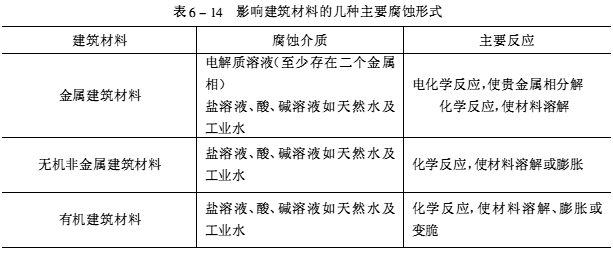 避免腐蚀的一个最重要因素是了解腐蚀是如何发生的。表6-14是影响建筑材料的几种主要腐蚀形式。