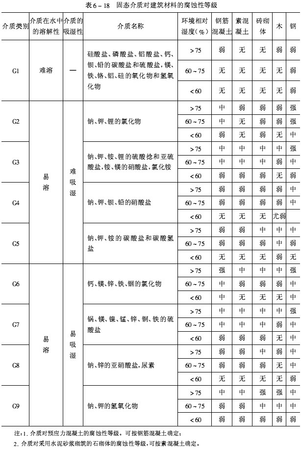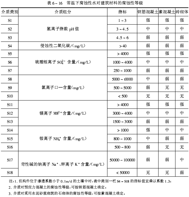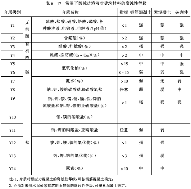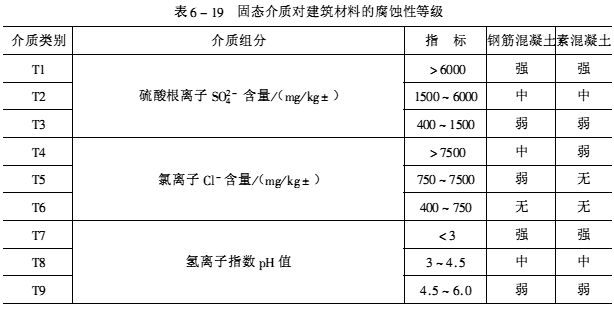根据腐蚀性介质的形态及其对建筑结构的腐蚀特征可分为五大类:即气态介质、腐蚀性水、酸碱盐溶液、固态介质和污染土。各种介质可按其性质、含量划分类别,根据各种介质对建筑材料长期作用下的腐蚀性,又可分为强腐蚀、中等腐蚀、弱腐蚀、无腐蚀四个等级,见表6-15~表6-19。设计、施工单位可按工程的腐蚀特征,选择适当的耐腐蚀材料和采取有效的防护措施。
