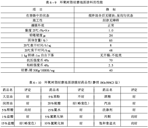 耐磨地面涂料的技术性能要求如表6-9、表6-10所示。因只是企业产品标准,这里只作为示例列出,不再列检测方法。