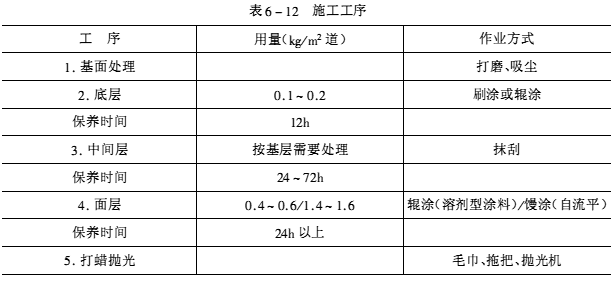 耐磨地面涂料的涂装工序主要有以下步骤,如表6-12所示。