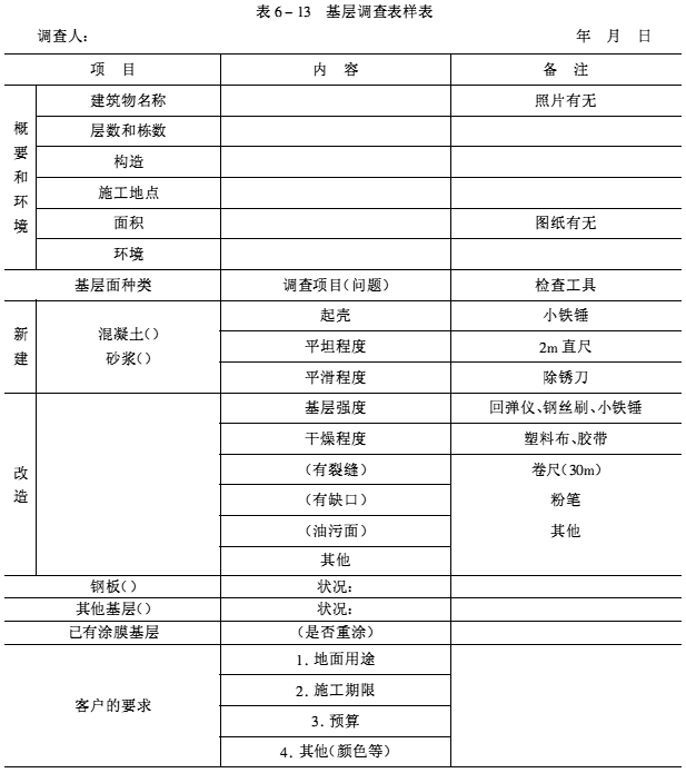 2)基面状况调查 通过现场检测工具对工作面进行全面细致的检查,并做好详细记录(参考样表,见表6-13)。地面施工属隐蔽工程,基层面状况务必调查清晰、纪录完整(可分解成多张图纸)。基层面的尺寸要单独表明在图纸上(精确到厘米)。