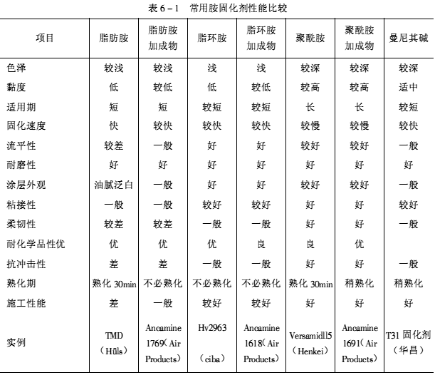 胺类固化剂是环氧涂料的主要固化剂,这类固化剂主要有脂肪胺、脂肪胺加成物、脂环胺、脂环胺加成物、聚酰胺、聚酰胺加成物、曼尼其碱等。表6-1为常用胺固化剂性能比较。