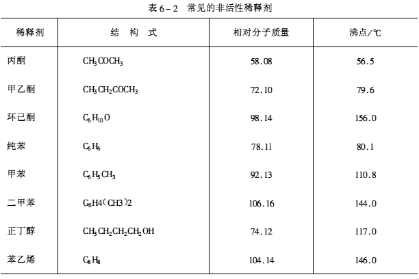 (1)非活性稀释剂本身不参与固化反应,仅达到物理混合和减低黏度的目的。一般加入量为树脂重量的5%~15%,在树脂固化时,会有部分逸出,从而增加树脂的收缩率,降低粘结力、机械强度及热变形温度,严重时甚至会产生气孔。溶剂型环氧地面涂料使用时应特别注意。常见的非活性稀释剂见表6-2。