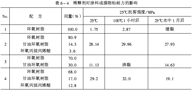 短,因而阻碍了链的形成,影响了成膜物的主要性能。例如:稀释剂及其浓度与固化后成膜的的粘结力关系见表6-4所示。