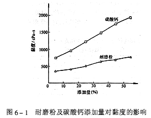 ![]() ![]() (2)填料添加量对涂料黏度的影响。无论是施工性还是从成膜物的性能看,地面涂料的黏度是至关重要的。一方面希望涂料的固体含量尽量高,可降低成本,达到一次成膜厚的目的;一方面又不希望黏度太高,黏度高不利于施工,影响成膜物的流平性、消泡性。通过实验发现:耐磨矿物粉加入量对涂料黏度影响变化较少(见图6-1)。这是由于天然矿物粉与碳酸钙相比有相对低的吸油量所致。在相同吸油量的涂料中(轻质)碳酸钙的加入量不超过30%,而天然矿物粉加入量可达50%以上。