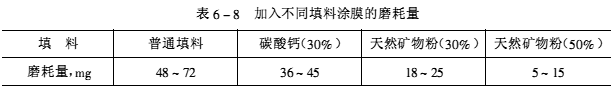 ![]() (4)填料对涂膜磨耗量的影响。根据GB/T1768—89实验测试,(CS17,500*2g,1000R。)结果见表6-8。