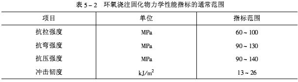 (2)力学特性检测浇注件力学性能的项目主要有抗张、抗弯、冲击及抗压强度,弹性模量、挠度等。作为电器绝缘的环氧浇注零件,其主要的力学性能指标范围见表5-2。但这些都是在实验室通过仪器检测出来的,在浇注件的实际工作中,评价和分析零件的蠕变强度和耐龟裂性更加必要。