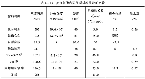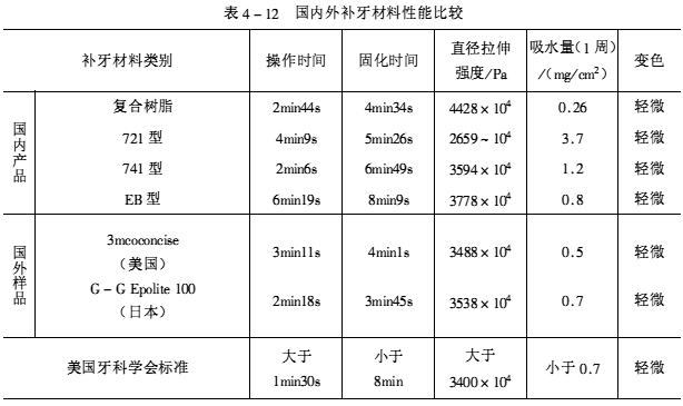 表4-12和表4-13列出了国内外几种树脂型补牙材料的性能比较。