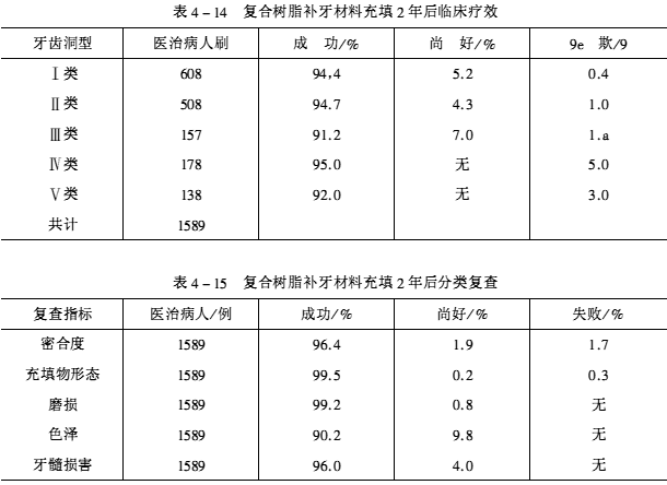 复合树脂充填牙齿窝洞的方法是:把调和好的补牙材料用塑料充填器迅速充入窝洞内,一般先将牙齿釉角釉壁充满,然后再将整个洞充填。充填应在1min内完成,充填后静等3min,不可再搅动充填体,使聚合反应在口腔温度条件下自然完成。复合树脂完全聚合要6~7min,聚合后取出隔离片,对需磨改的部位可用蘸水小圆石或金刚砂轮修磨,以恢复形态。复合树脂补牙材料充填2年后临床疗效见表4~14。