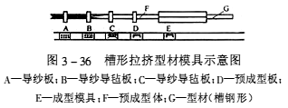![]() (4)槽形型材成型模具 槽形拉挤型材的增强材料配置形式一般用毡、纱、毡形式,其模具组合形式如图3-36所示。