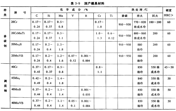 (3)模具材料 应能满足以下要求:强度高,热处理变形小,加工性能好,易抛光,耐磨、耐热及耐热腐蚀等。完全都能满足这些要求的材料为数不多,价格昂贵。设计模具时应按其主要要求考虑。国产模具材料见表3-9。
