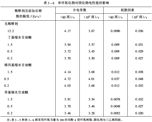 常用活性稀释剂的化学结构及其性状见表3-1、阻燃性活性稀释剂结构及其性状见表3-2、二溴代甲苯基缩水甘油醚(DBTGE)的阻燃性见表3-3、几种活性稀释剂的稀释效果见表3-4、单环氧化物对固化物的物理机械性能影响见表3-5、单环氧化物对固化物电性能的影响见表3-6、几种活性稀释剂的固化物特性见表3-7。