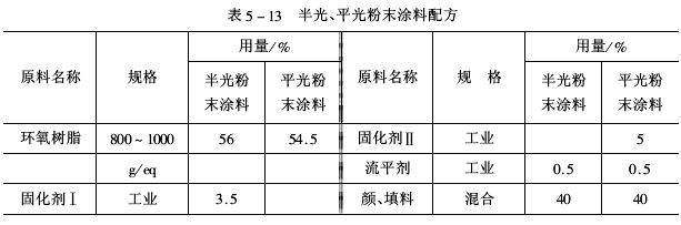 环氧-聚酯系粉末涂料见表5-11,环氧珠光粉末涂料见表5-12,半光(或平光)粉末涂料见表5-13,白色有光环氧粉末涂料见表5-14,丙烯酸-环氧粉末涂料见表5-15,环氧电泳粉末涂料见表5-16。
