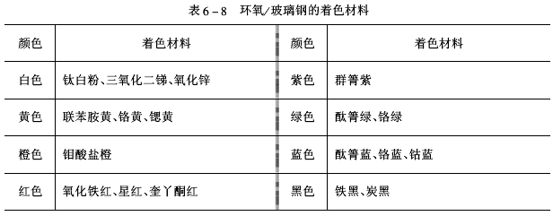 四、着色材料 玻璃钢制品、胶粘剂和涂料等着色后可增加美观,提高商品档次。 1.理想的着色剂应具备的条件 (1)色彩美艳,着色力和遮盖力强。 (2)在树脂中容易分散、不影响树脂的固化,也不降低树脂原来性能。 (3)耐热性好,在树脂的加工温度和最高使用温度下有良好的热稳定性,不变色,不分解,而且能够长期耐热。 (4)有良好的耐酸碱性,与树脂中其他助剂不发生有害的化学反应。 着色材料从结构上可分有机染料和无机颜料两类,两者的主要区别是溶解性不同。染料可溶于水、油、有机溶剂等,分子内一般都含有发色基团和助色基团,具有强烈的着染能力,色泽鲜艳,色谱齐全。但耐候性、耐溶剂性等较差,常用的有缩合偶氮类、酞箐系、阴丹士林系、喹丫酮系、异吲哚系等。而且它主要用于各种纤维的印染。表6-8列出了环氧/玻璃钢的各种着色材料,从中可见要是染料。