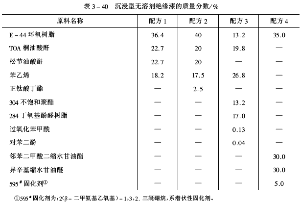 无溶剂型环氧浸渍漆见表3-35,高固体分环氧防腐蚀涂料见表3-36,无溶剂型环氧防腐蚀涂料见表3-37,无溶剂型环氧胶液见表3-38,电容器用环氧包封料见表3-39,沉浸型无溶剂绝缘漆见表3-40,滴浸型无溶剂绝缘漆见表3-41,无溶剂绝缘漆性能见表3-42。
