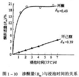 介质对环氧涂膜的渗透量(Rm)随δR增加而增大,即δR值越大,环氧涂膜抵挡渗透介质穿透能力越弱,Rm值越大;δR值越小,环氧涂膜抵挡渗透介质穿透能力越强、Rm值越小。配方6涂膜的渗酮、酯试验结果如图1-10和图1-11所示。