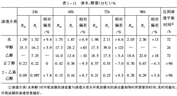 水和醇对环氧涂膜(配方6)的渗透量结果见表1-11。