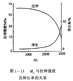 交联固化形成五种涂膜。其拉伸强度随Mc增加而缓慢下降,当在Mc=2400附近,拉伸强度随Mc增加而明显下降;涂膜的伸长率在Mc<2400时,基本上不随Mc增加而变化,当在Mc=2400附近,伸长率随Mc增加而急剧上升。如图1-13所示。