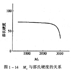 形成涂膜的邵氏硬度与Mc的关系,也在Mc=2400附近出现突变,是由于涂膜的有效交联密度低到一定限度后而产生柔韧性突变所致。如图1-14所示。