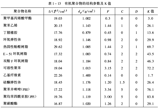有机聚合物的结构常数(K)由溶度参数(δ)和化学结构参数(F+C+D)交互作用决定。δ是聚合链段间相互作用或极性强度对K值的贡献;(F+C+D)是聚合物成键原子(或基团)间的相互作用K值的贡献。δ(F+C+D)表征聚合物的形态结构和化学结构交互效应(cross effect)而产生的聚合物结构常数K值。