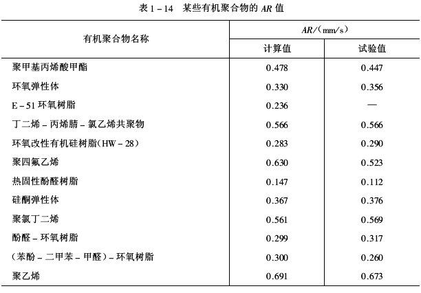 理论计算的AR值和试验测定的AR值基本相符。通过理论计算和试验测定都能较准确地选择烧蚀隔热涂料的基料,而理论计算是一种更快捷有效的选材方法,可以缩短时间、提高效率。某些有机聚合物的AR值见表1-14。