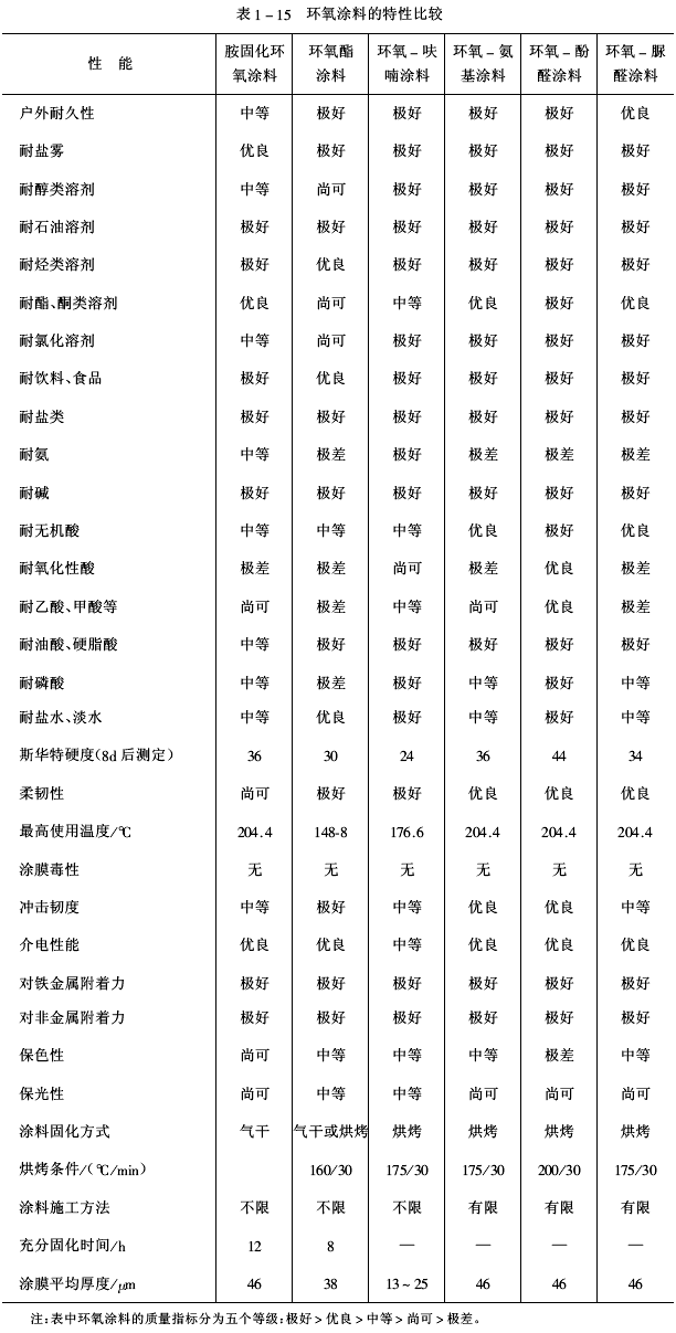 的结构、固化剂的性质及固化条件、各种助剂的功效等因素,这是环氧涂料配方设计时应解决的问题。尽管环氧涂料有许多优点,但其户外耐候性和耐含氧酸性差,为克服上述缺点,已有新品种问世。环氧涂料的特性比较见表1-15。
