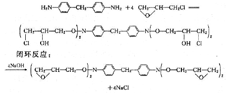 (1)合成 通常含有缩水甘油基树脂的合成分两步进行。首先氨基进攻环氧氯丙烷的环氧基生成氯代醇;然后在碱作用下(氢氧化钠)发生闭环反应,生成缩水甘油胺和氯化钠。此两步反应常常同时发生,实际合成是使用过量的环氧氯丙烷,这样既可作为溶剂,又可抑制低聚物的生成。环氧氯丙烷和多元胺反应是剧烈的放热反应,必须在良好的搅拌状态下,逐渐滴加环氧氯丙烷,并加强冷却。以下以二氨基二苯甲烷为例表示主要反应式。 氯代醇的生成: